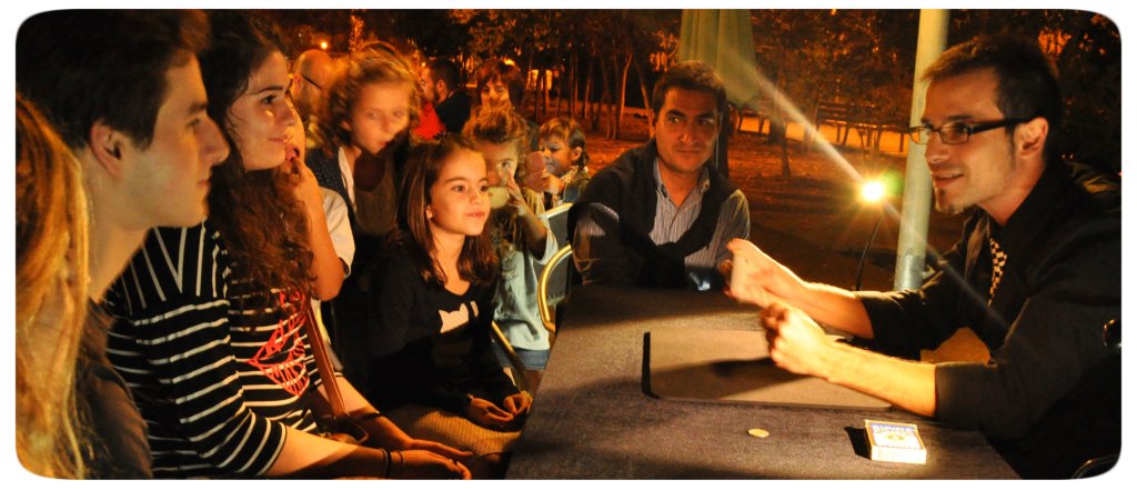 Magia de cerca . Sorprende a los espectadores a pocos centímetros de estos . Realizada para pequeños grupos de personas y dirigida a amenizar espacios distendidos .
